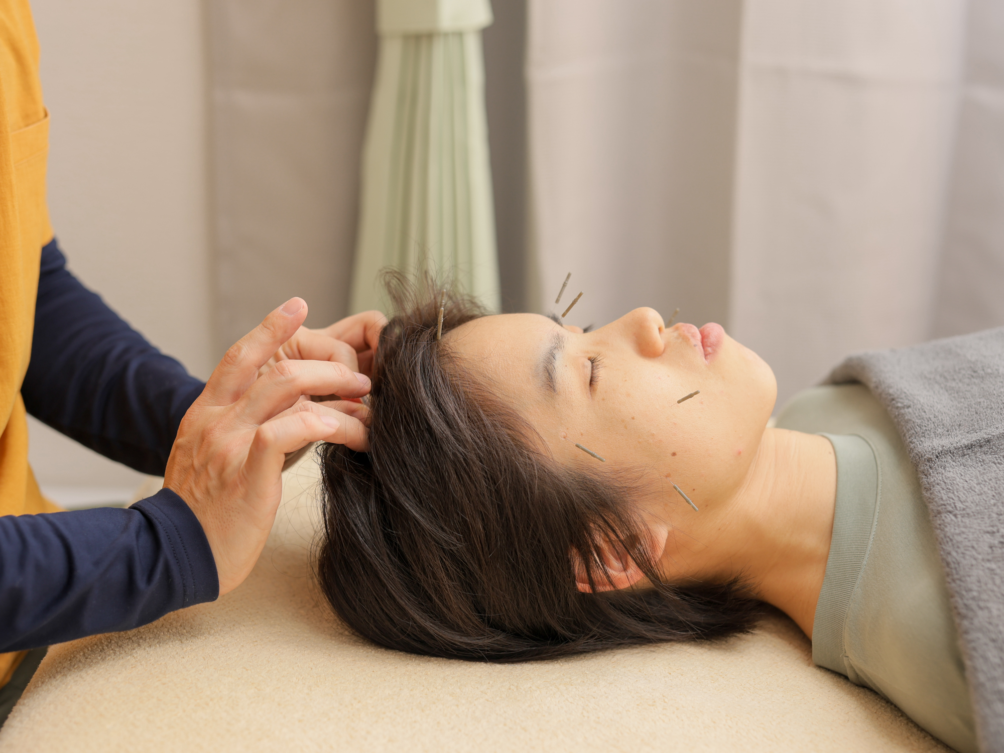 頭皮の血流を改善して毛根に栄養を届けるのはもちろん、首や肩のツボにも鍼を打って自律神経のバランスも整えます。