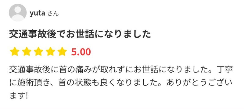 交通事故後に首の痛みが取れずにお世話になりました。丁寧に施術頂き、首の状態も良くなりました。ありがとうございます!
